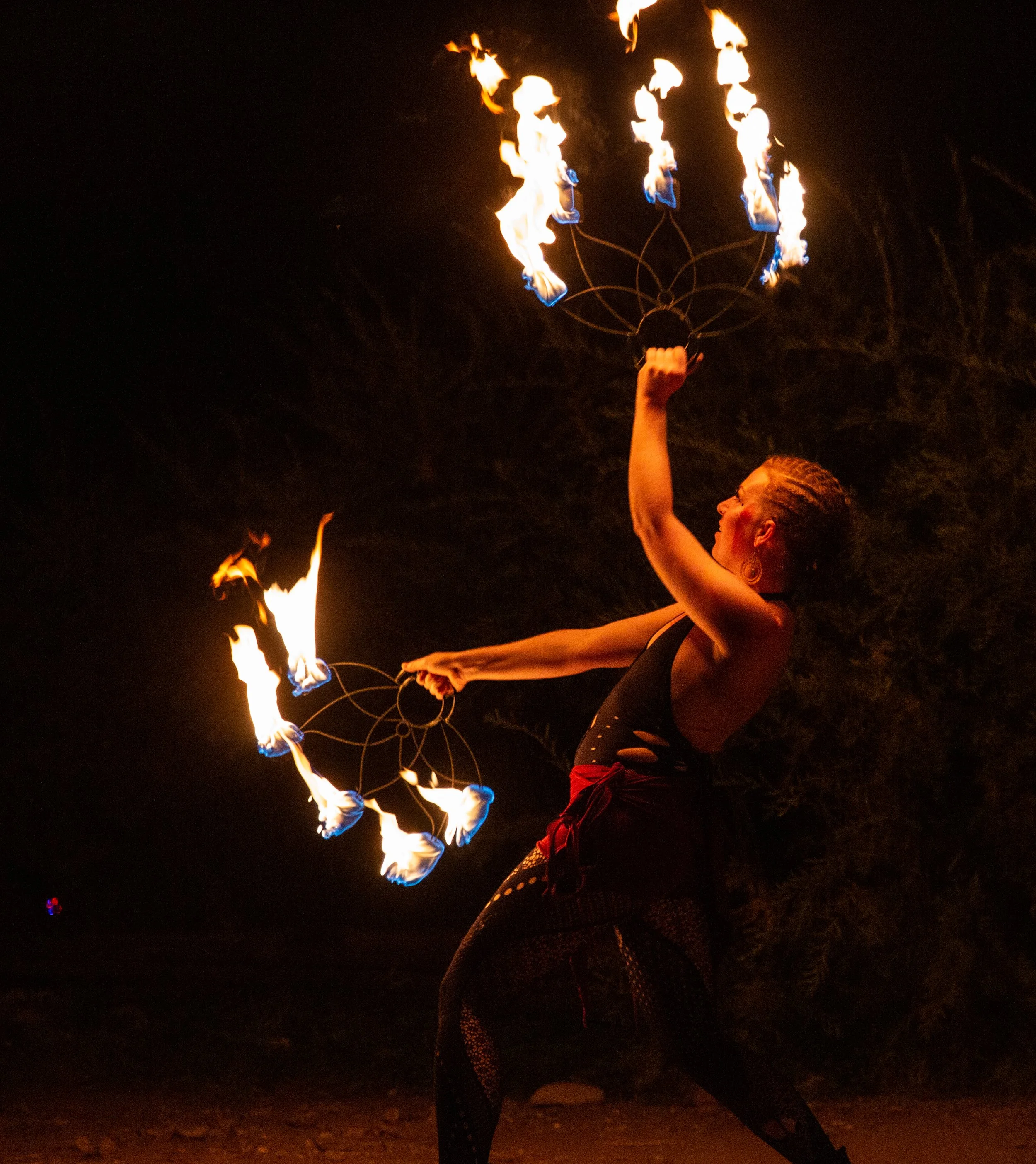 Intricate and mesmerizing, my performance is a dynamic fusion of movement and expression. Through skillful manipulation of various props such as, fire hula-hoops, fire fans, dragon staff, fire sword, palm torches, LED hoops, and silk fans, I create a visual symphony that resonates with the rhythm of the music. My flow art is not only a display of technique, it is a vibrant, immersive experience that adds a unique dimension to the atmosphere in which I am performing. Fluid transitions and captivating layers showcase my mastery, transforming the performance space into a captivating spectacle and a unique highlight to the musical acts I dance with.